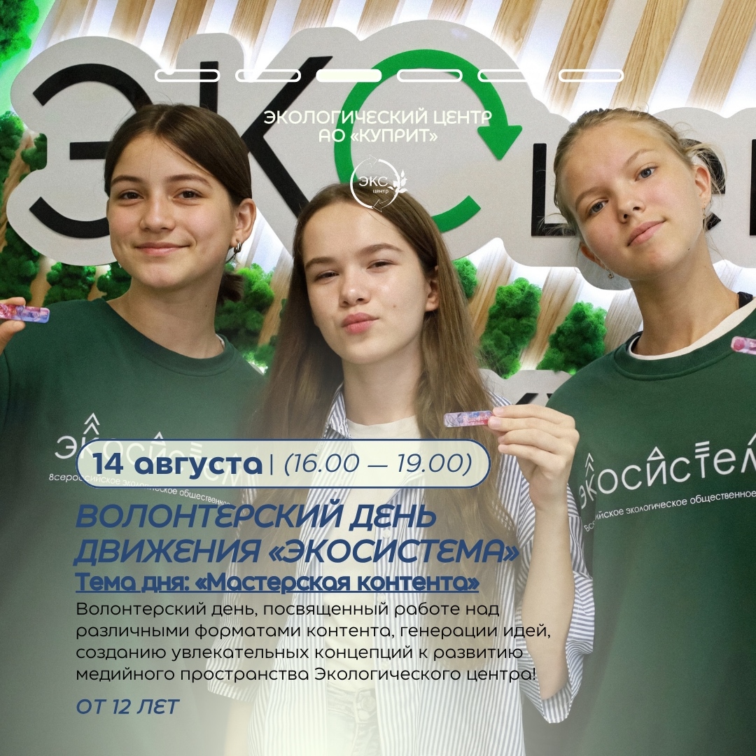 Волонтерский день движения “Экосистема” Тема дня: “Мастерская контента” Дата Авг 14 2025 Expired! Время 16:00 - 19:00 Расположение Экоцентр ул. Дерендяева, 64, Киров Телефон +7 (8332) 63-16-11 Организатор АО "Куприт" Телефон 63-16-11 Поделиться событием