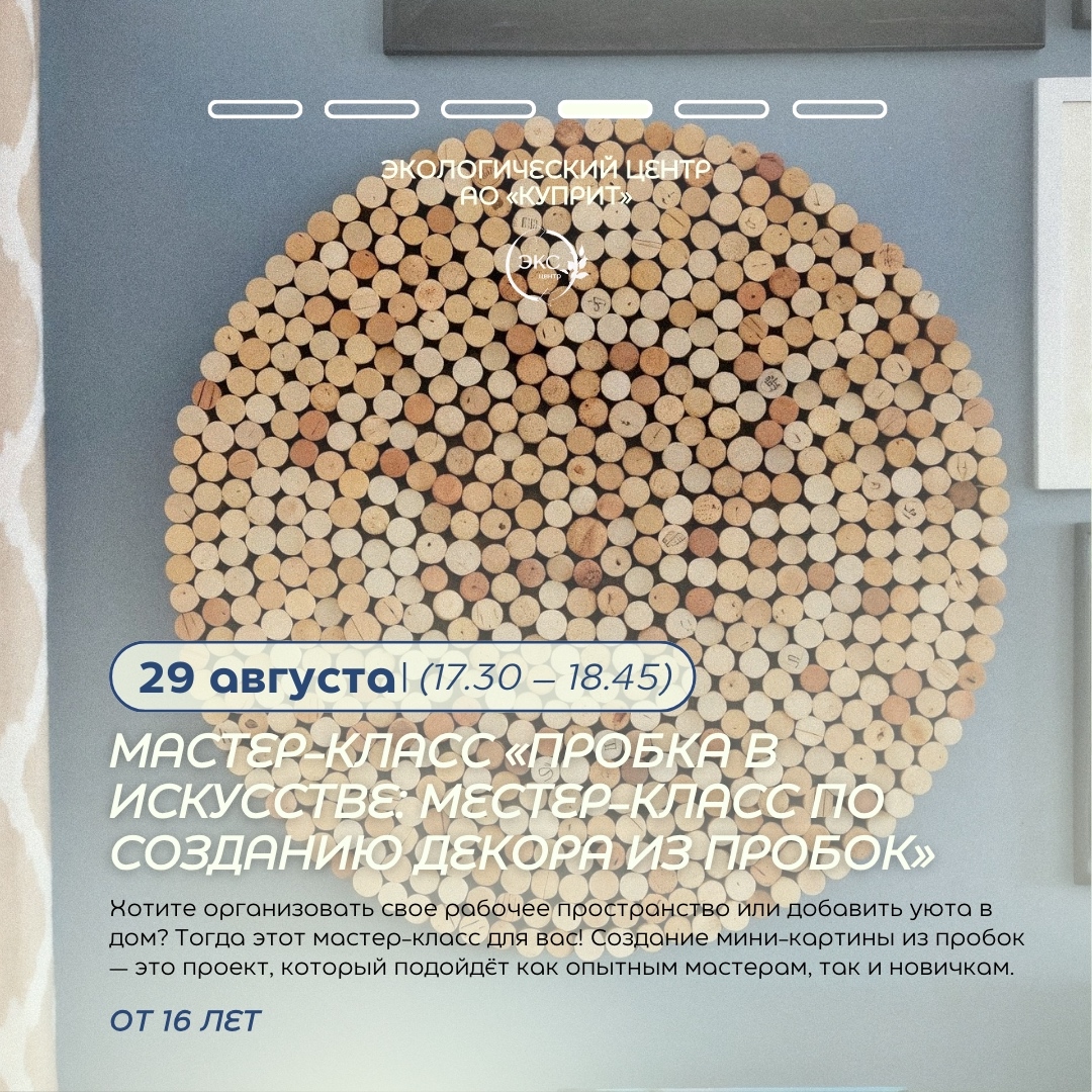 Мастер-класс “Пробка в искусстве: мастер-класс по созданию декора из пробок” Дата Авг 29 2025 Expired! Время 17:30 - 18:45 Расположение Экоцентр ул. Дерендяева, 64, Киров Телефон +7 (8332) 63-16-11 Организатор АО "Куприт" Телефон 63-16-11 Поделиться событием